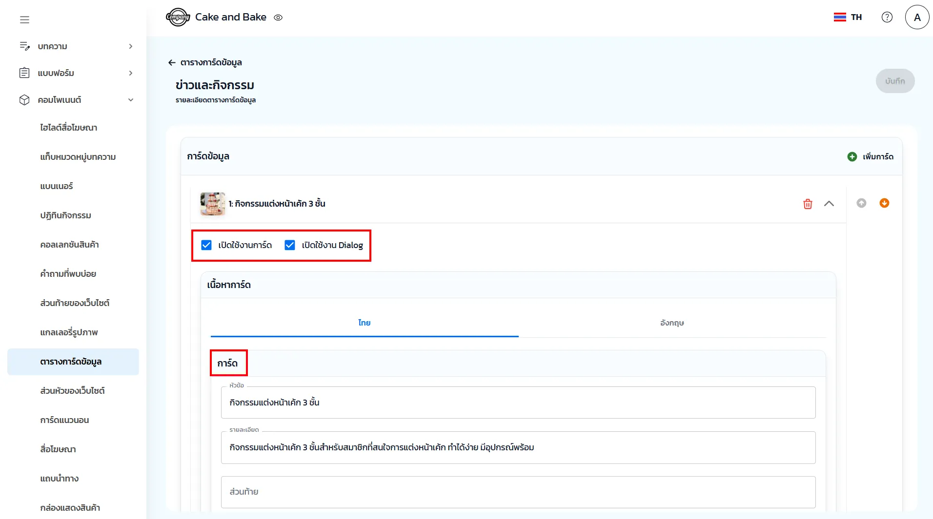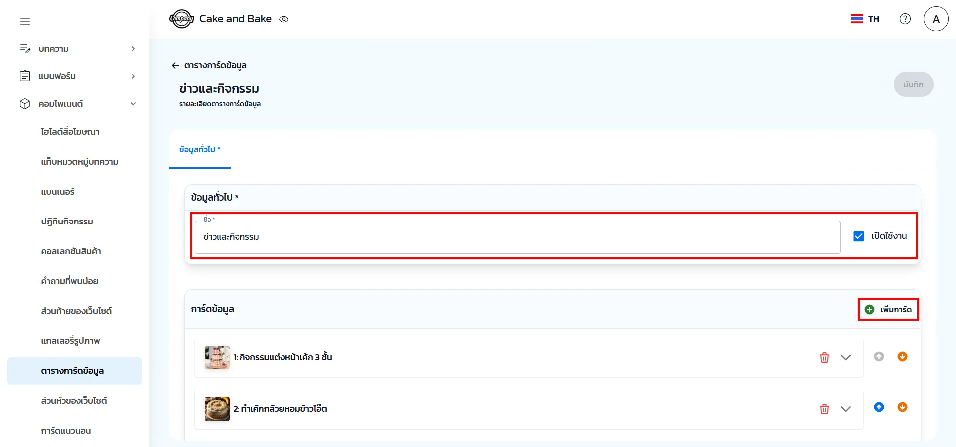 2. ข้อมูลทั่วไป กำหนดชื่อหัวข้อ เลือกเปิดใช้งาน และเพิ่มการ์ดสำหรับใส่รายละเอียดข้อมูลที่ต้องการ