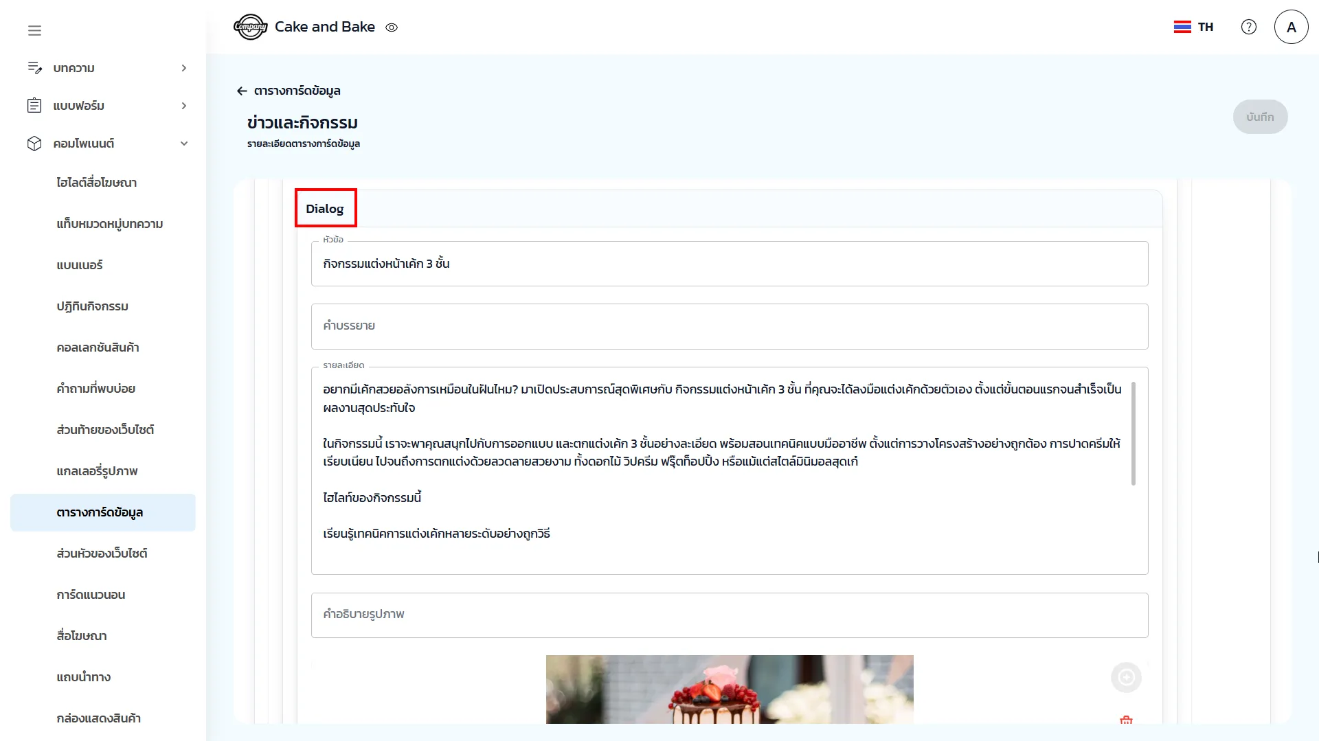 ส่วนของการ์ด คือ การกำหนดหัวข้อ รายละเอียด ส่วนท้าย คำอธิบายรูปภาพ และอัปโหลดรูปภาพ