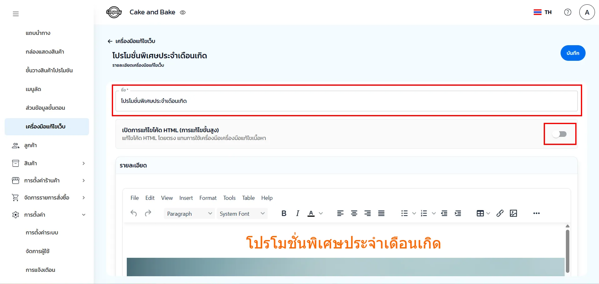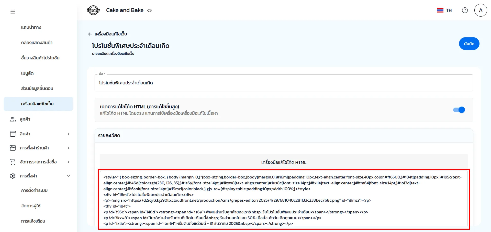 4. การแสดงผลของสคริปต์ เมื่อเปิดใช้งานการแก้ไขโค้ด HTML (การแก้ไขขั้นสูง) แต่ถ้าหากต้องการกลับไปใช้งานโหมดเดิม ให้คลิก Toggle เพื่อปิดการใช้งานการแก้ไขโค้ด HTML