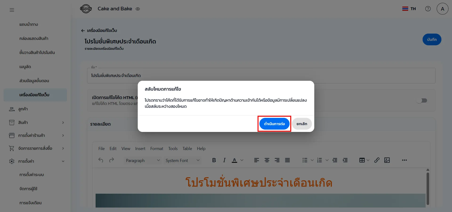 3. เมื่อคลิก เปิดใช้งาน ระบบจะมี Popup แจ้งเตือนการสลับโหมดการแก้ไขให้ทราบ