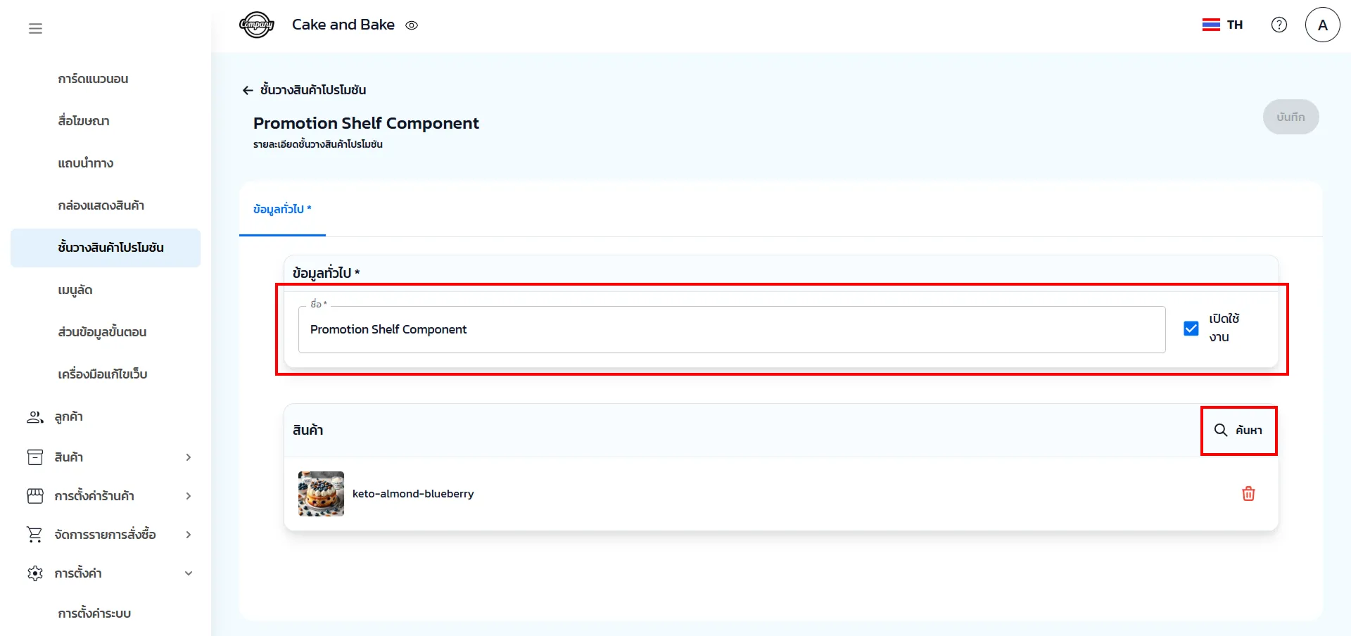 2. ข้อมูลทั่วไป ระบุชื่อ เลือกเปิดใช้งาน และค้นหาสินค้าที่ต้องการให้แสดงบนชั้นวางสินค้าโปรโมชันนี้